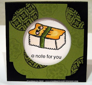 Look! 3x3 Note cards with little Sushi! The envelopes are also stamped (using Old Olive ink) with one of the designs from the new stamp set. The message "a note for you" is from Sweet Little Sentiments (retired SU).