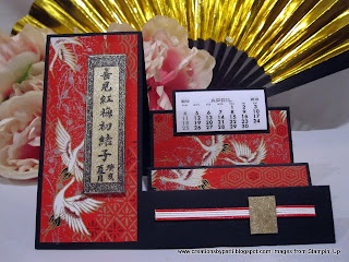 This is a card I received in the mail TODAY from Gene L.! I was so excited because it is made in my very favorite colors and it is ASIAN! This is a elegant step card with beautiful Washi paper. Finished card size is 4-1/4" x 5-1/2". She also sent sample Washi cuttings in Black/Red/White - nice touch!!!! Gene gave permission for me to share this wonderful card with you all since she doesn't have a blog yet.