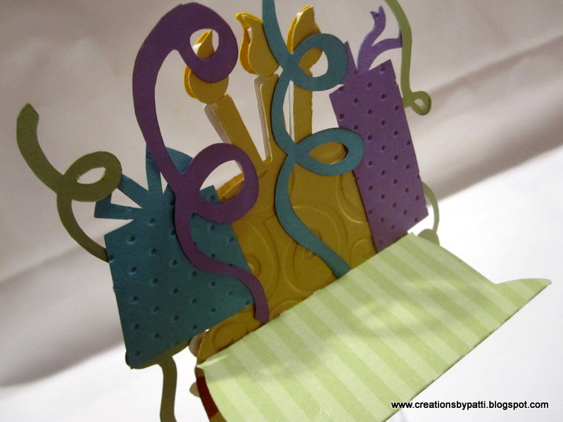 I made this card for a good friend's birthday. The Cake Easel SVG cut file is from My Scrap Chick found here. I added the Presents cut file from the Silhouette Retail store called Christmas Gifts Boarder. Cuttlebug Swiss Dot Embossing Folder on presents. I made some changes to the presents cut file: cut and separated the gifts with the "knife" in the program and chose the two I wanted to use, then removed the inside cuts on the taller present as well as added the "t" to resemble ribbon. Confetti Strings is also from the Silhouette Retail store. Designer Paper used is originally from K and Company but has been in my stash for a while. Solid paper used is Stampin-Up So Saffron and Certainly Celery. The Brown, lavender, Turquoise, and White used is from Recollections. Ink all the edges using brown ink.
