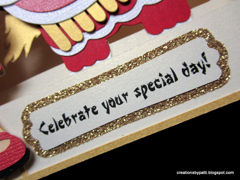 Top half of the first layer of this card hangs red (my favorite color) lanterns. You can also see the third panel (layer) where The Asian Pillar is attached with characters translating to: Happy Birthday.